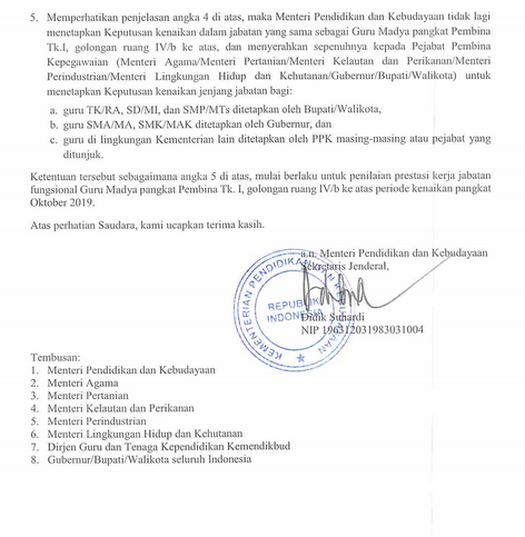 Kemudian, Keputusan tersebut mulai berlaku untuk Penialaian Prestasi Kerja Jabatan Fungsional Guru Madya Pangkat Pembina TK. I, Gol. Ruang IV/b kea atas Periode Kenaikan Pangkat Oktober 2019.