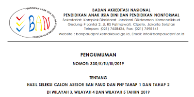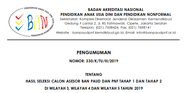 Silahkan simak informasi berikut ini berdasarkan surat edaran BAN PAUD dan PNF Nomor: 330/K/TU/III/2019 tentang Hasil Seleksi Calon Asesor BAN PAUD dan PNF Tahap 1 dan Tahap 2 di Wilayah 3, Wilayah 4 dan Wilayah 5 Tahun 2019.