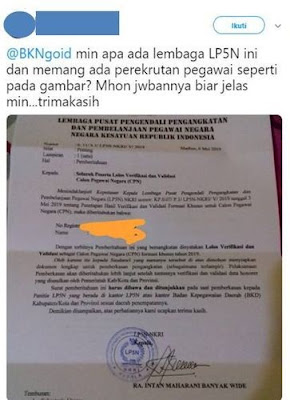"@BKNgoid min apa ada lembaga LP5N ini dan memang ada perekrutan pegawai seperti pada gambar? Mhon jwabannya biar jelas min...trimakasih," tulis salah satu akun.