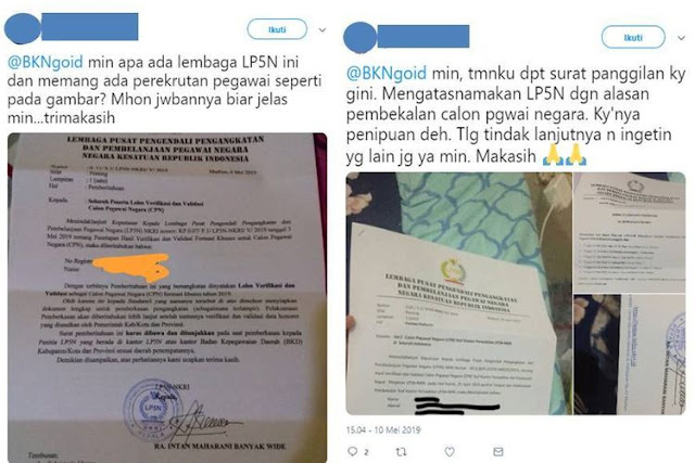 Ada pula satu akun yang mengunggah surat panggilan pembekalan CPNS seperti berikut: "@BKNgoid min, tmnku dpt surat panggilan ky gini. Mengatasnamakan LP5N dgn alasan pembekalan calon pgawai negara. Ky'nya penipuan deh. Tlg tindah lanjutnya n ingetin yg lain jg ya min. Makasih," tulis akun lain.