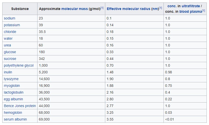 | table of permselectivity for different substances in the glomerulus of the kidney in renal filtration |