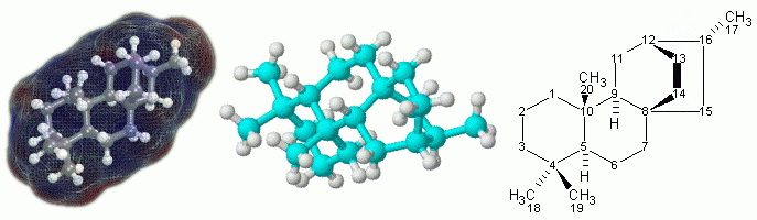 | Representasi 3D (kiri dan tengah) dan 2D (kanan) dari molekul terpenoid atisana. |