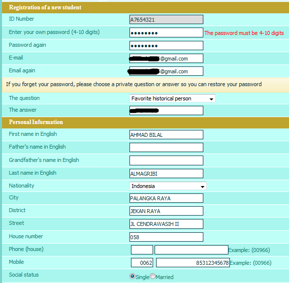 3. Password/sandi HARUS ANGKA. Isi email dan pertanyaan keamanan. Nama diisi sesuai nama asli di paspor saja tanpa nama Ayah dan Kakek. Kecuali nama di paspor Antum sudah ditambah nama Ayah. Pokoknya ikuti paspor. Baca Kesalahan Fatal Penulisan Nama Pendaftar Beasiswa Arab Saudi! Negara, Kota/Kabupaten, Kecamatan, Jalan, Nomor Rumah, Nomor Hp dengan kode 0062 untuk Indonesia, lalu Status lajang atau menikah