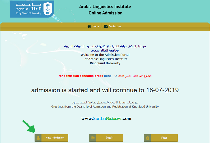 1. Akseslah web Ma'had Lughoh Jaami'ah Malik Su'ud di https://ali-admit.ksu.edu.sa akan tampil seperti gambar di bawah. Klik New Admission!