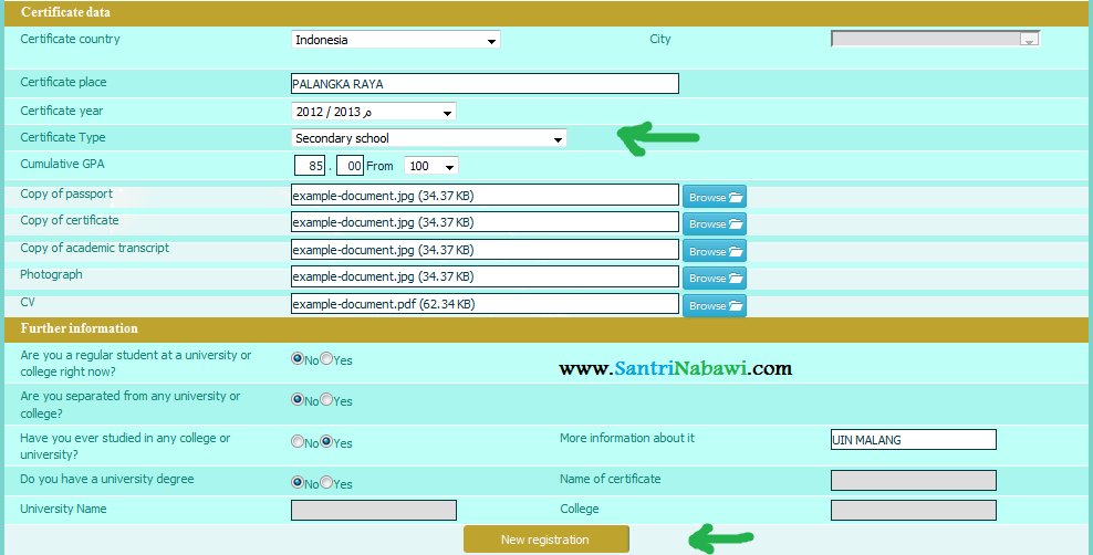 5. Negara ijazah, kota/kabupaten, tahun lulus, tipe ijazah terakhir SMA (Secondary) atau S1 (Bachelor). Cumulative GPA: Nilai rata-rata misal 85.00 dari total 100 poin. Upload file bisa foto .jpg atau pdf. Furher information yang pertama harus pilih No walaupun Antum sedang kuliah di suatu kampus Indonesia, kalau tidak pendaftaran tidak akan bisa selesai. Nama kampus Indo yang Antum pernah atau sedang studi di sana bisa ditulis di yang ketiga tidak masalah. Klik New registration!