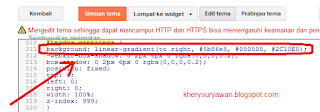 7. Jika anda hanya ingin menggunakan satu warna saja maka silahkan anda masukkan 1 kode warna saja pada script background saja dan hapus script yang bertuliskan background: linear-gradient(to right, #5b86e5, #36d1dc); , namun jika anda ingin memasukkan 2 warna atau lebih maka silahkan anda masukkan 2 kode warna atau lebih pada script background: linear-gradient dan hapus kode yang bertuliskan background: #5b86e5; Perlu diingat bahwa untuk setiap kode warna di batasi dengan tanda koma.