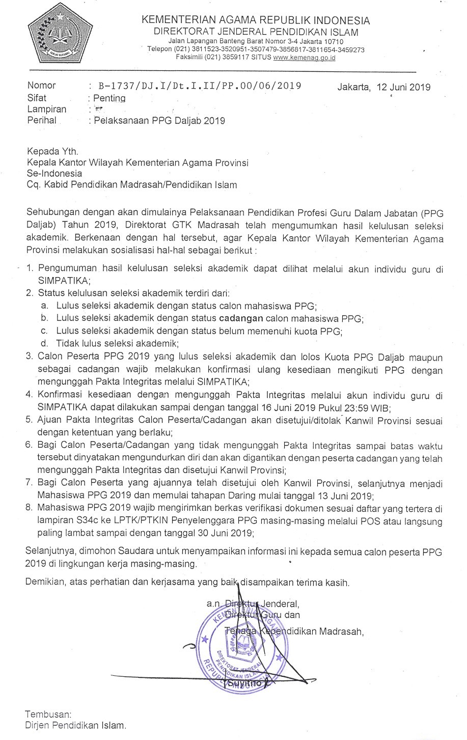 Sehubungan dengan akan dimulainya Pelaksanaan Pendidikan Profesi Guru Dalam Jabatan (PPG Daljab) Tahun 2019, Direktorat GTK Madrasah telah mengumumkan hasil kelulusan seleksi akademik. Berkenaan dengan hal tersebut, agar Kepala Kantor Wilayah Kementerian Agama Provinsi melakukan sosialisasi hal-hal sebagai berikut: