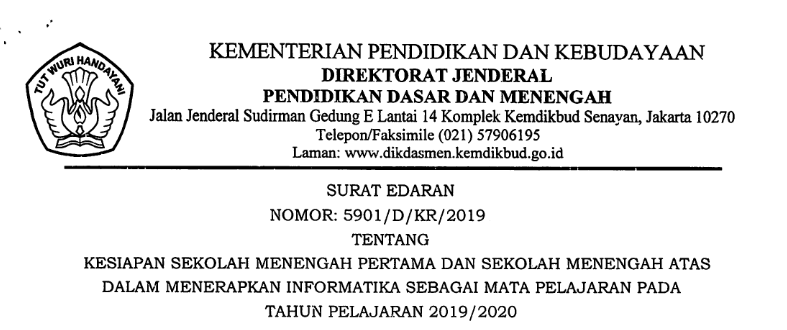 Salam semangat buat Guru-guru dan Tenaga Kependidikan. Kementerian Pendidikan dan Kebudayaan Direktorat Jenderal Pendidikan Dasar dan Menengah (Dirjen Dikdasmen) mengeluarkan Surat Edaran Nomor: 5901/D/KR/2019 tentang Kesiapan Sekolah Menengah Pertama dan Sekolah Menengah Atas dalam Menerapkan Informatika sebagai Mata Pelajaran pada Tahun Pelajaran 2019/2020.