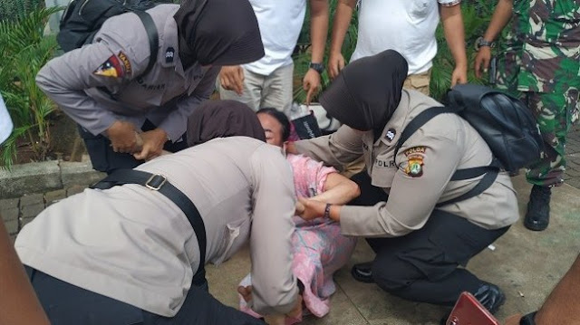 Aparat kepolisian yang berjaga lantas menghampiri wanita tersebut. Saat dihampiri, wanita itu justru semakin mengamuk.