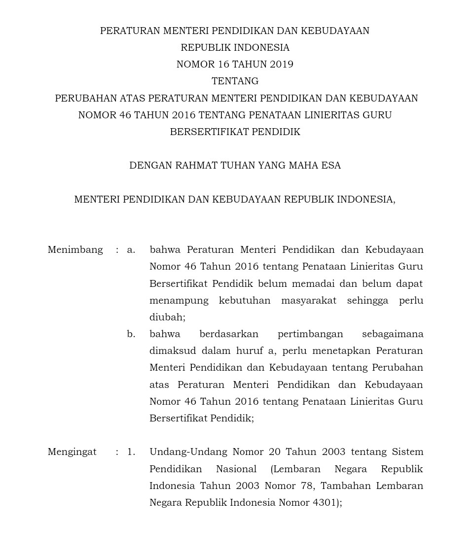 Permendikbud Nomor 16 Tahun 2019 ini merupakan Permendikbud tentang Perubahan Atas peraturan Menteri Pendidikan dan Kebudayan Nomor 46 Tahun 2016 tentang Penataan Linearitas Guru Bersertifikat Pendidik. Seperti yang telah disebutkan didalam Permendikbud Nomor 16 Tahun 2019 bahwa Permendikbud Nomor 46 Tahun 2016 dipandang belum memadai serta belum bisa menampung kebutuhan masyarakat sehingga menjadi alasan pertimbangan didalam mengubah Permendikbud tersebut.